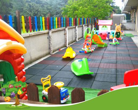 L’asilo dispone di un grande spazio esterno di circa 120 mq. circondato dal verde e attrezzato con giochi e attività per l’aria aperta.